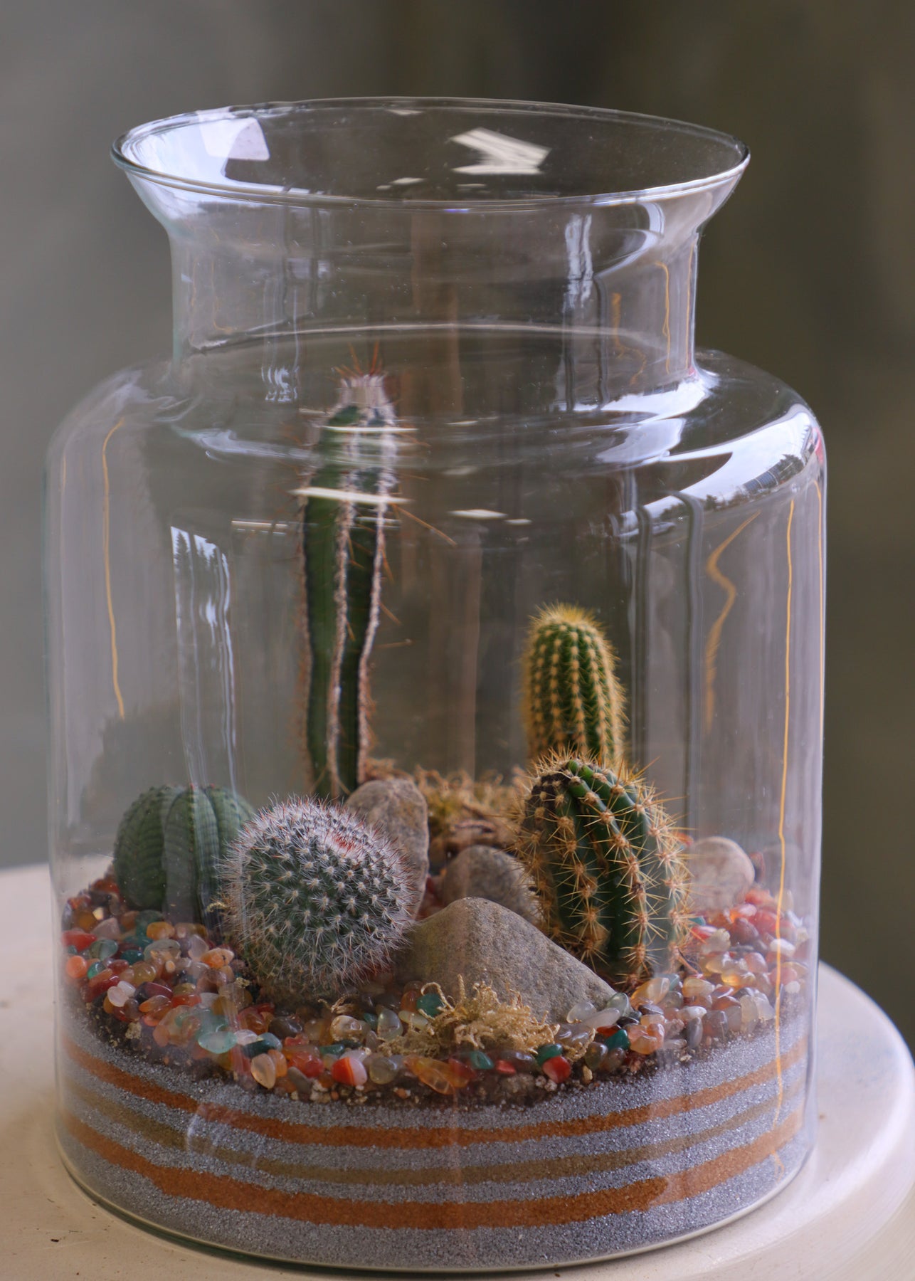 Meet Desert Glass Terrarium, a little slice of modern desert magic in a jar. A mix of sculptural cacti is planted in a tall clear glass vessel, finished with layered decorative sands, natural stones, and colorful pebbles to create a miniature landscape you can admire from every angle.