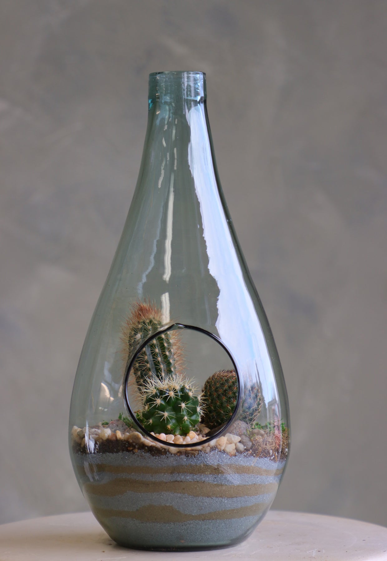 Meet Glass Oasis Terrarium, a modern desert garden captured inside a teardrop-shaped glass vessel. Layers of decorative sand, pebbles, rocks, and a mix of desert-loving plants create a tiny landscape you can admire from every angle through the round front opening.