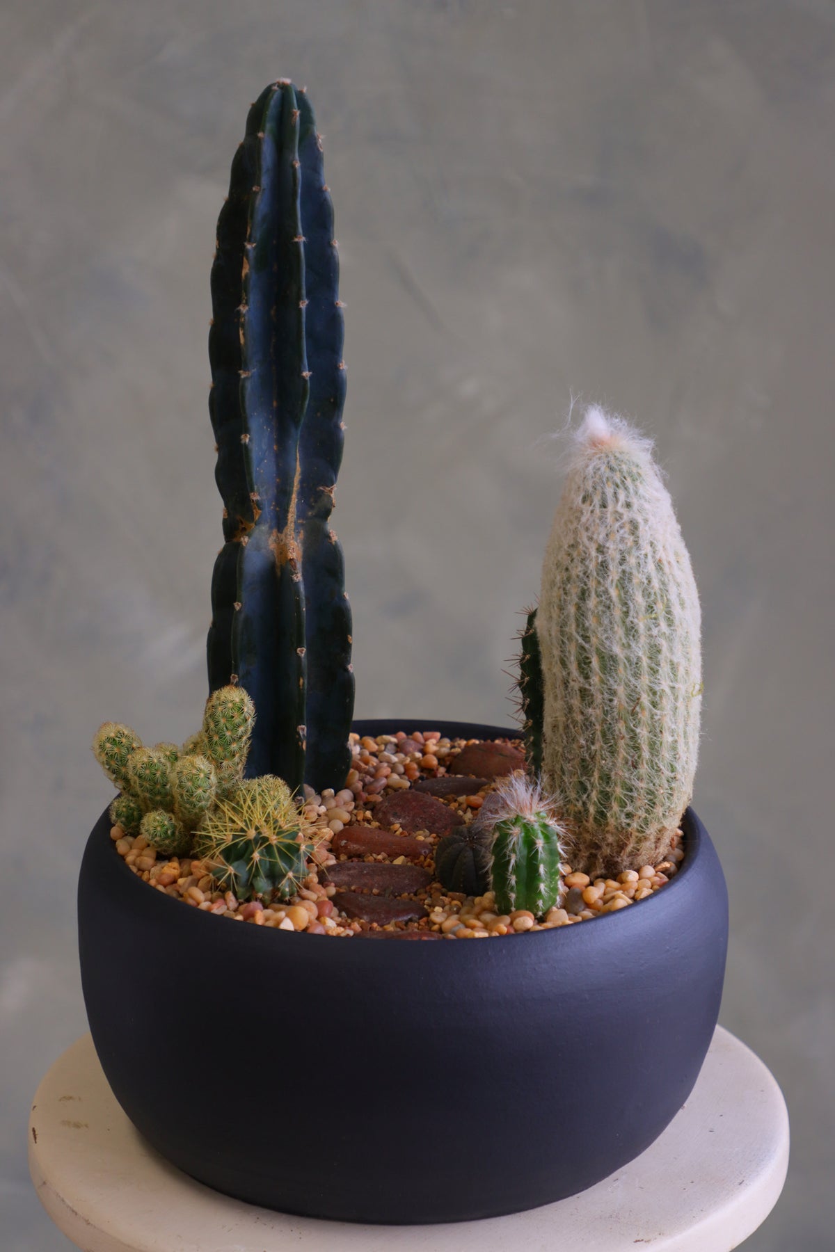Meet Midnight Desert Garden, a bold mini landscape that looks like a tiny desert under the night sky. A sculptural mix of tall and petite cacti is arranged in a deep matte charcoal pot, finished with warm pebbles and earthy accents for a clean, modern look. The contrasting shapes and textures—from towering columns to round, spiky clusters—make this piece feel like a little cactus city in miniature.
