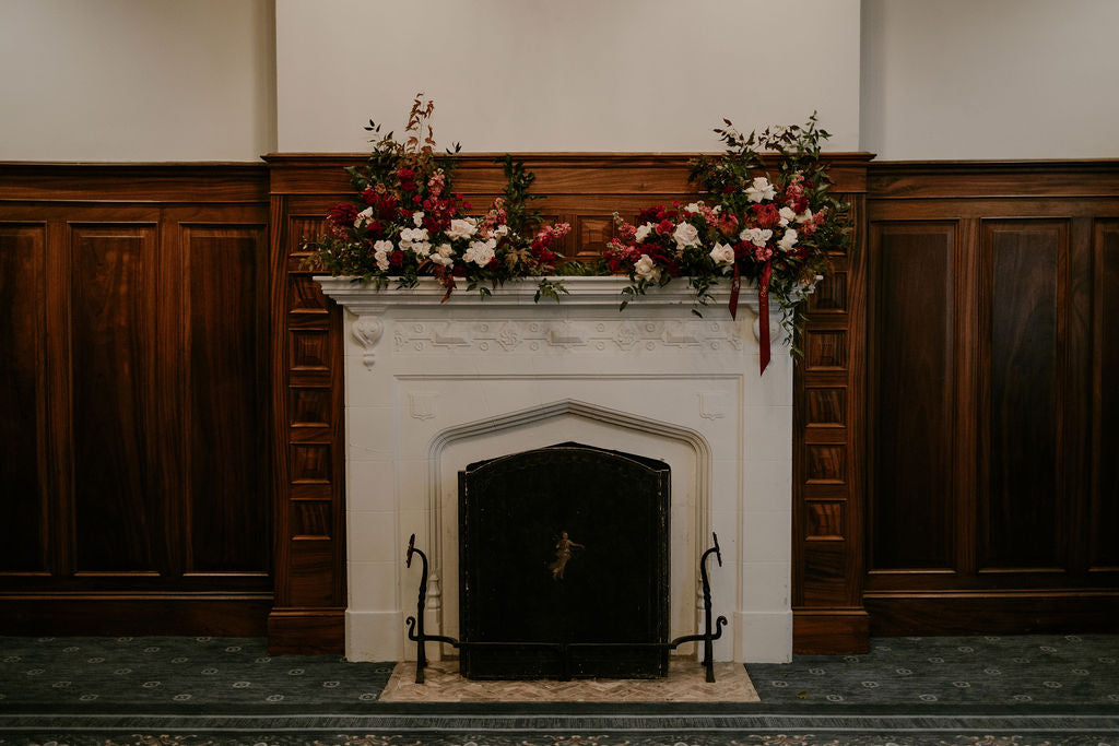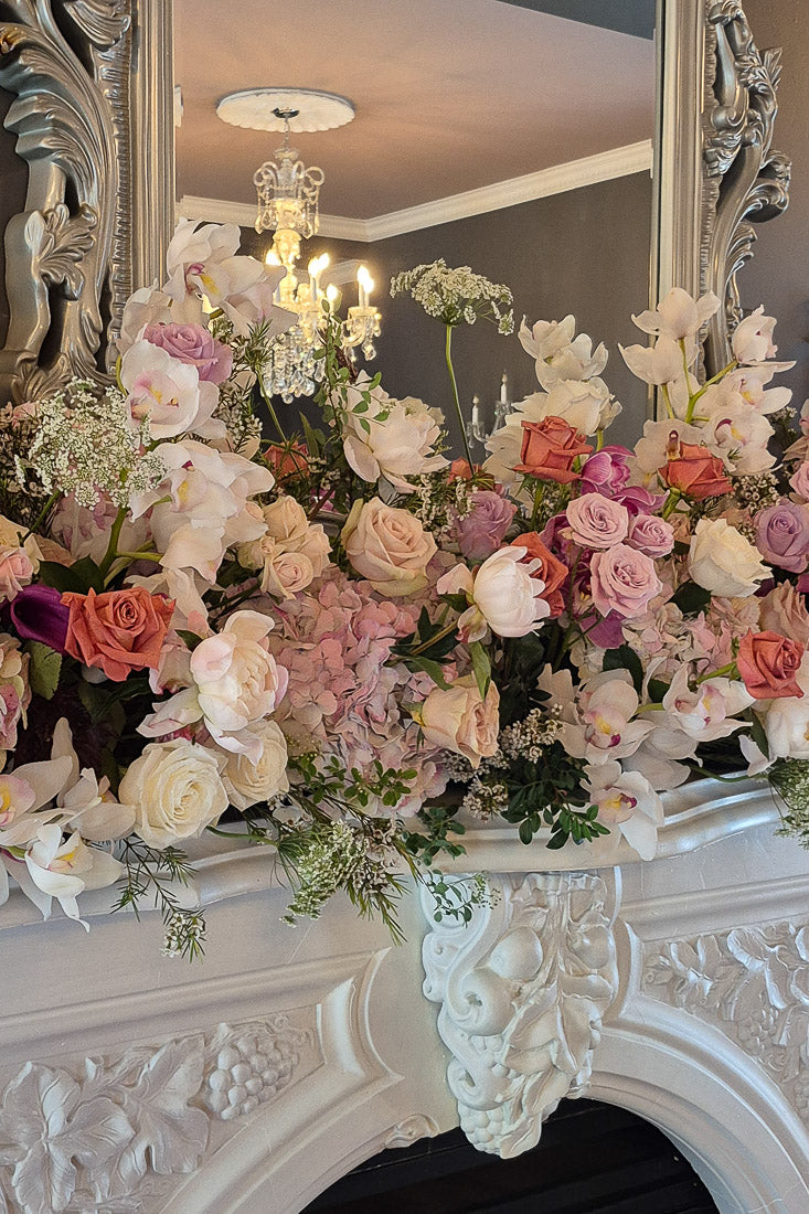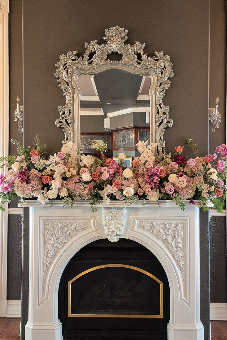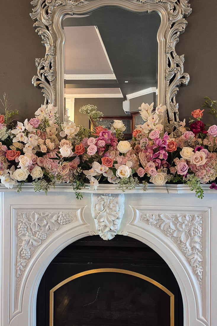 Each arrangement is front-centred in design, with lush florals focused on the viewing side and clean greenery at the back. This intentional one-sided composition ensures the flowers sit naturally against the fireplace or mantel, creating a polished, photo-ready focal point without unnecessary bulk. Available in a selection of curated color palettes and multiple size options, fireplace florals can be tailored to suit both intimate settings and grand architectural features.