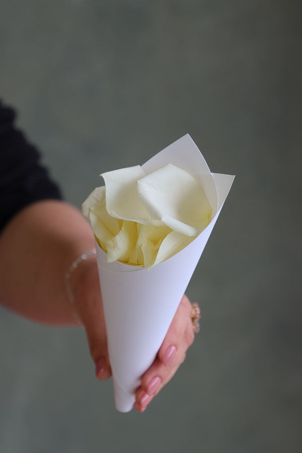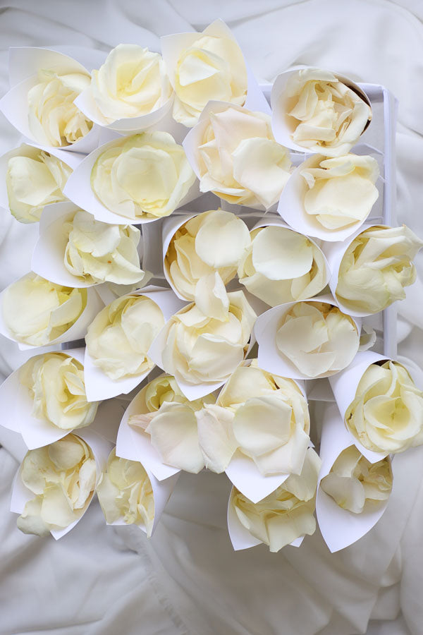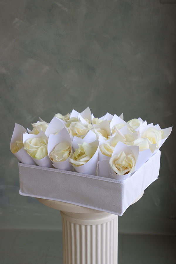 - Fresh rose petals packaged in 24 individual paper cones