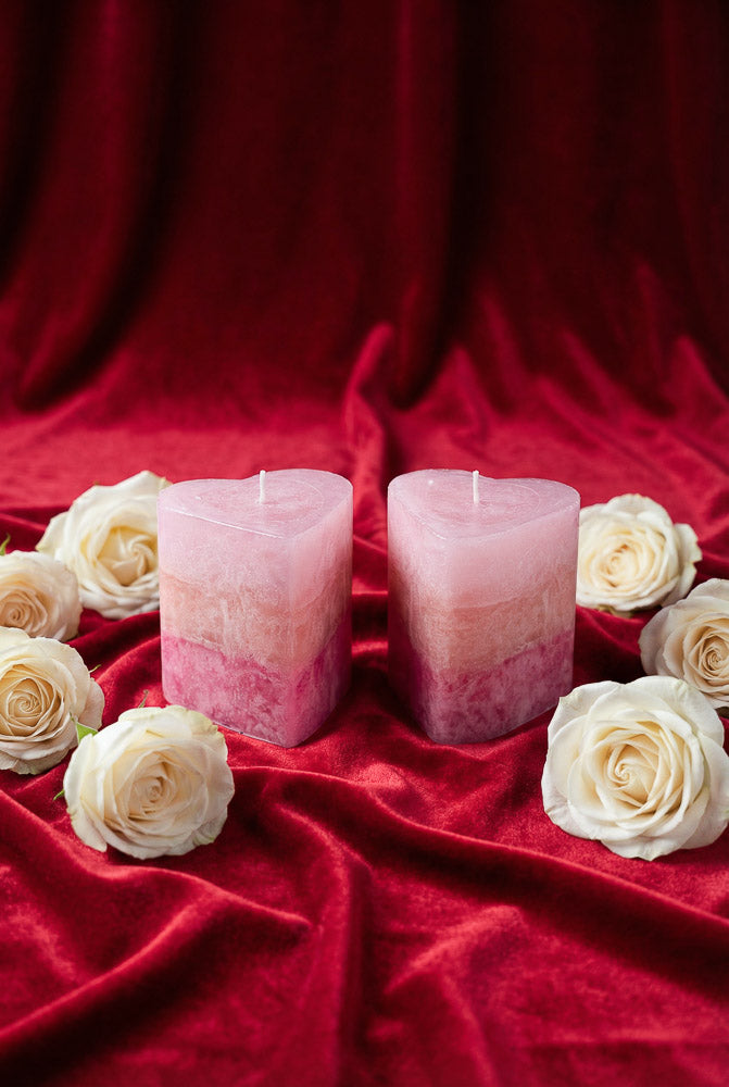 Two blush pink rose-toned pillar candles with a heart-inspired shape, surrounded by white roses on a velvet background for Valentine’s Day