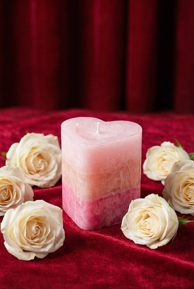 Blush pink rose-toned pillar candle with a heart-inspired shape, surrounded by white roses on a velvet background for Valentine’s Day